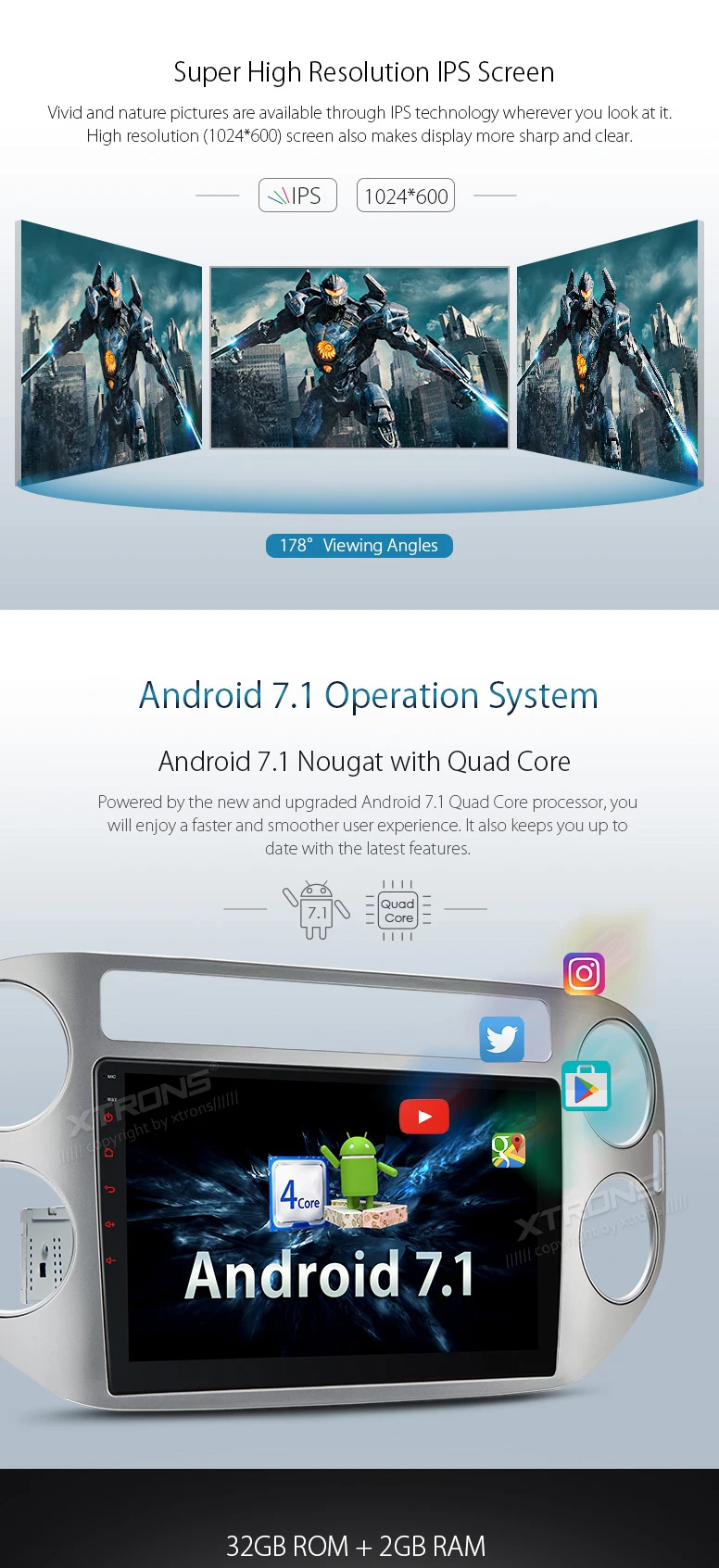 9" 2.5D Curved Screen Quad Core 2GB RAM 32GB ROM Android 7.1 Nougat OSSpecialCar Multimedia Navigation GPS Radio forVolkswagen Tiguan 2011 2012 2013 2014 2015 2016with 178 Degrees Viewing Angles IPS Screen & Full RCA Output Support &4G/3G/WIFI Internet Support &External DAB+ Receiver Box Support & OBD2 Adapter Support & Front DVR Camera Support Important Notice before the Purchase/Delivery: 1. This unit does NOT support your car's Dynaudio Sound System. 2. XTRONS has provided two emergency light button covers to help installation. 3. Please check whether there is original reversing camera in your car, if there is and you want to retain your vehicle's original reversing camera function, you need to order an extra video decoder box from us.(XTRONS ICE/SS/CAMDCV02 is compatible) 4. The parking sensor support function is limited to the vehicles equipped with the parking sensors. 5. Although we have made every effort to ensure this item be compatible with the listed vehicles, please check the year, dimensions and shape of the center console of your vehicles before purchasing. 6. Please note that this unit does not come with any GPS map and the navigation software has to be downloaded from the Google Play store. 7. This car radio's screen mirroring function is compatible with most of smartphones, but not all smartphones. 8. The USB and SD maximum capacity is 128GB, but the files in the USB stick or SD card should be within 4GB. Optional Items/Function Modules: 1. Universal Rear CameraCAM009: USD28.00 2. External MicrophoneMIC001:USD7.00(1.70Meters) 3. External MicrophoneMIC002: USD10.00(3.00Meters) 4.Bluetooth OBD2 BoxOBD02: USD15.00 5.4G/3G Internet USB Modem& USBWIFIRouter4GDONG001: USD65.00 6. WCDMA 3G Dongle3GDON008: USD40.00 7.External Wired 720PDVR CameraDVR019: USD35.00 8.External WIFI Wireless1080PDVR CameraDVR022: USD95.00 9.External DAB+ BoxUSBDAB01: USD55.00 10.2.4GHz Wireless Mini KeyboardAMK003: USD28.00 11. External Wirless TPMS SystemTPMS02: USD75.00(Solar Charging Power Supply, with 4 External Sensors) 12.Single AntennaMPEG2/4 DVB-TDigital TV Receiver BoxFV009: USD75.00 13. Dual AntennasMPEG2/4 DVB-TDigital TV Receiver BoxFV010: USD95.00 14. Dual AntennasH.264 HEVC/DVB-T2/MPEG2/4 DVB-TDigital TV Receiver BoxFV011: USD132.00 15. Dual AntennasH.265 HEVC/H.264 AVC/1080i/1080P/DVB-T2/MPEG2/4 DVB-TDigital TV Receiver BoxFV012DE: USD148.00(for Germany & Austria) 16. Video Decoder Box for original reversing cameraICE/SS/CAMDCV02: USD32.00 If you were fromEuropean Union Countries(Including UK)and you worried aboutbeing involved in customs clearance problem and being charged with potential high import tax/customs duty, we would like torecommend you tochoose our special free tax UK delivery service which costs an additional USD45.00. With the delivery from the UKwarehouse to you, there will be neither customs clearance problem to you nor any import tax or customs duty to you. Normally it takes 10 to 15 days for thewhole delivery procedure. You can choose the special free tax UK delivery service(some countries shipped by UK DPD, some other countries shipped by UK DHL)by any of thetwo methods as below: 1. Please choose the "Seller's Shipping Method" when you are placing the order. Below is the reference picture for you. And please note that the parcel is also trackable. We will provide you the tracking number and tracking website. 2. If you do not understand/know how to do with the first method above, you can pay the additional USD45.00 via the link below directly: https://www.aliexpress.com/store/product/Payment-Link-for-Special-UK-EU-Delivery-Service-Additional-Shipping-Cost/1185837_32809573401.html Please note that the listedcompatible models are only for reference only. To make sure that the car radio is really compatible with your car, please compare the shape & size of the car radio and the power cable connector with your original car first. Compatible for belowVolkswagenmodels: *Volkswagen Tiguan 2011-2016 Reading before Placing Order 1.Usually we'll confirm with you for some important information: Delivery address, requested declared value, buyer's car model & year versionand pictures of the car’scenter console. Please reply to us in time, otherwise we'll not be responsible for the potentialshipment delay, wrong destination delivery or compatibility problem. 2. If you have anything special to remind us, (such as requested declared value, color, relevant car model and year, picture of your car’s center console, etc., ) please leave message while placing order. 3.Before signing with the courier, please make sure thatthe package is well packed and make sure thatthere are no damage for the outer box and the item inside. 4. It is absolutely not accepted to report that the parcel was empty or there are no main unit in the package after the parcel receiving sign with the courier. Important Tips: 1. Normally the orders will be processed within 48 hours after payment released from AliExpress. 1) In case the item was out of stock, we need more time to prepare. 2) Please check your email or AliExpress message after the purchase in case we have to confirm with you for some necessary information. Or it may will cause the delivery delay. 2. Please leave the exact address, normally PO Box address is not accepted. Normally, address should be with house number and street number. 3. Please make sure that the address provided on AliExpress is correct and updated for successful parcel delivery. 4. For Brazil delivery, normally only HK Post Air Parcel shipping is provided. 1) If you want commercial express delivery, CPF number (for individual) or CNPJ number (for company) is a must. 2) Please make sure that you can receive the parcel if sent by commercial express companies and you are willing to pay relevant import tax/customs fee. 5. For Russia delivery, normally only HK Post Air Parcel shipping or some special Russia shipping company is provided. 1) No express shipping is provided because of cust